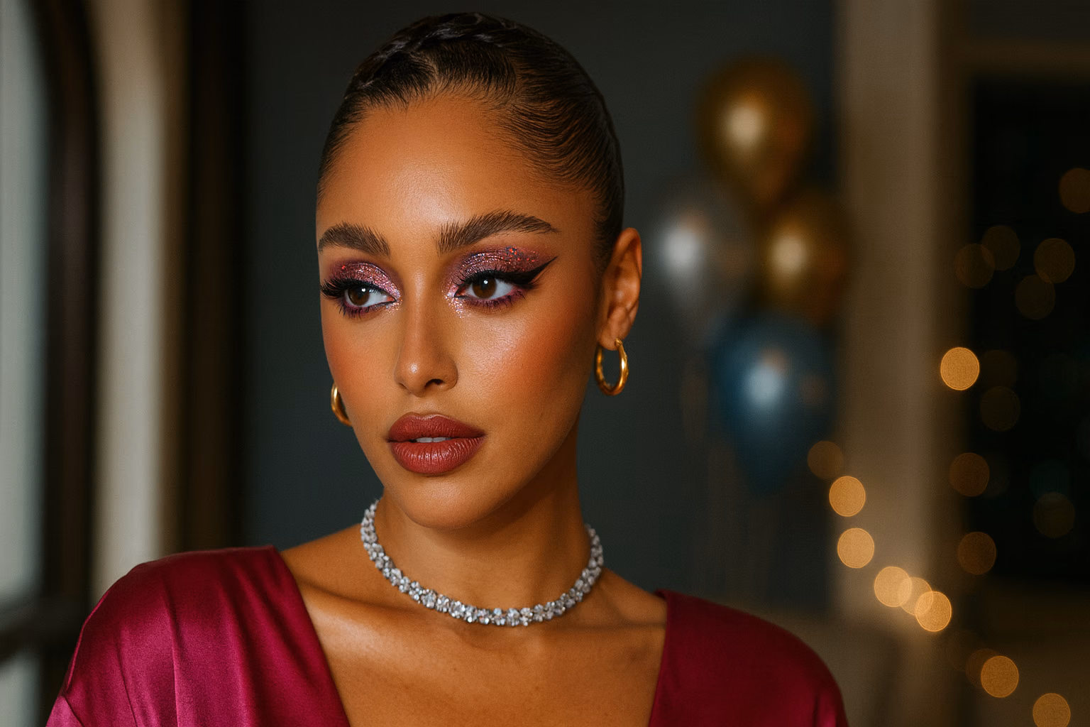 If your party takes place in a rooftop lounge or a dimly lit restaurant, this style ensures all eyes are on you. This look shifts the focus to expressive eyes using deep tones and expert blending.