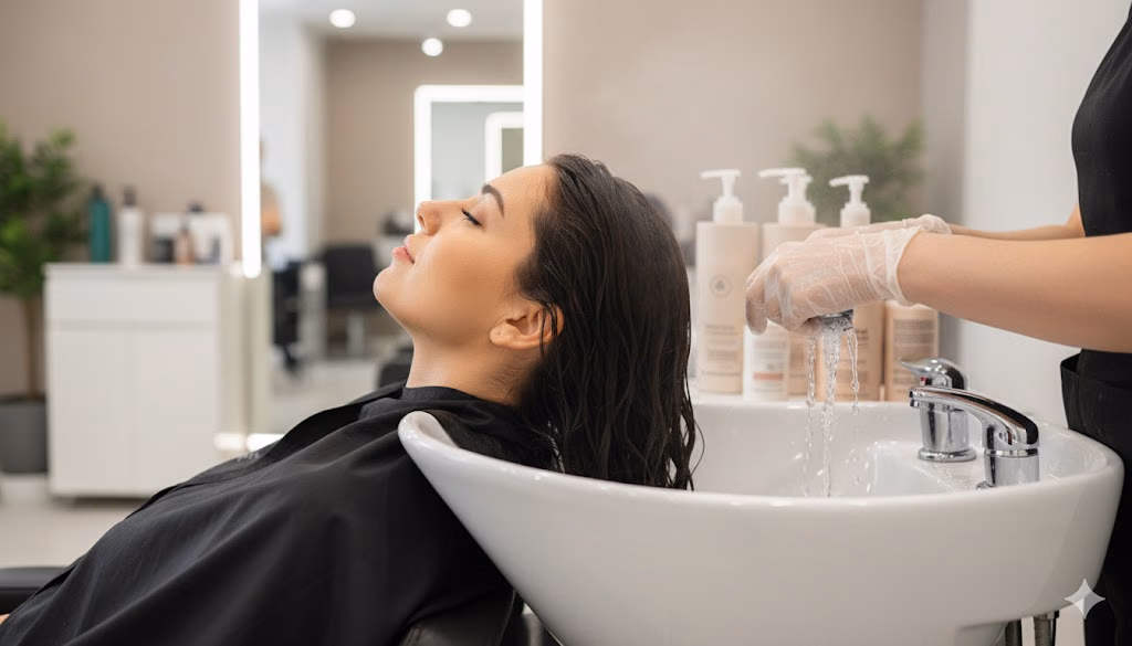 Most salons begin with a clarifying cleanse. This removes minerals from Dubai water, old styling product, and silicone residue. If you skip this step, conditioning agents struggle to enter the hair fibre and the results fade fast.