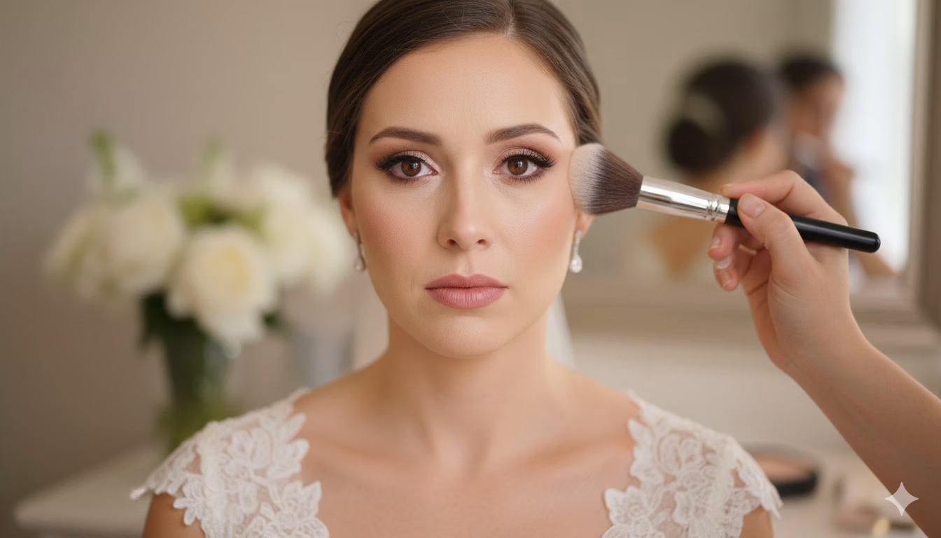 Wedding cameras pick up texture, dryness, and flashback. That is why you see makeup artists controlling three areas closely: