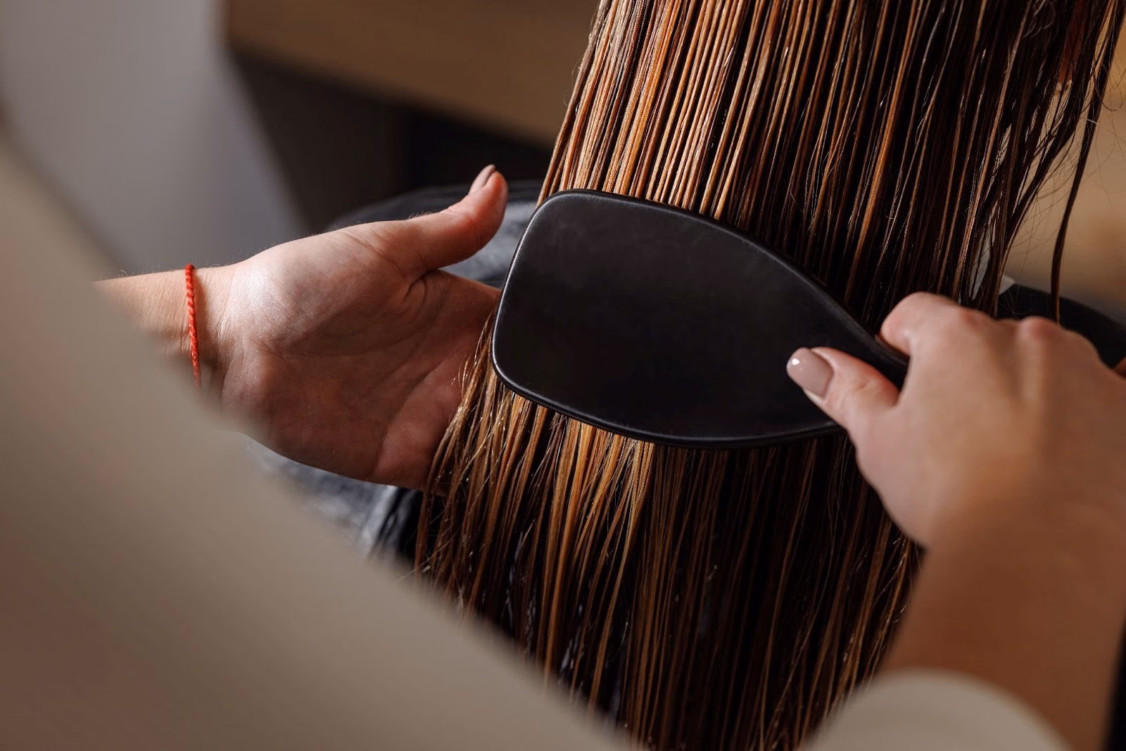 - Application of the Hair Botox formula: the product is distributed evenly from mid-lengths to ends. Clients describe the sensation as gentle and soothing.