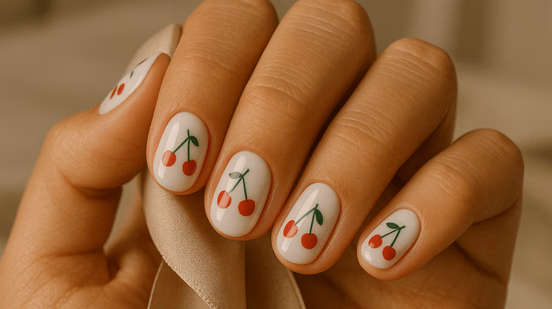 Cherry prints on short rounded nails,